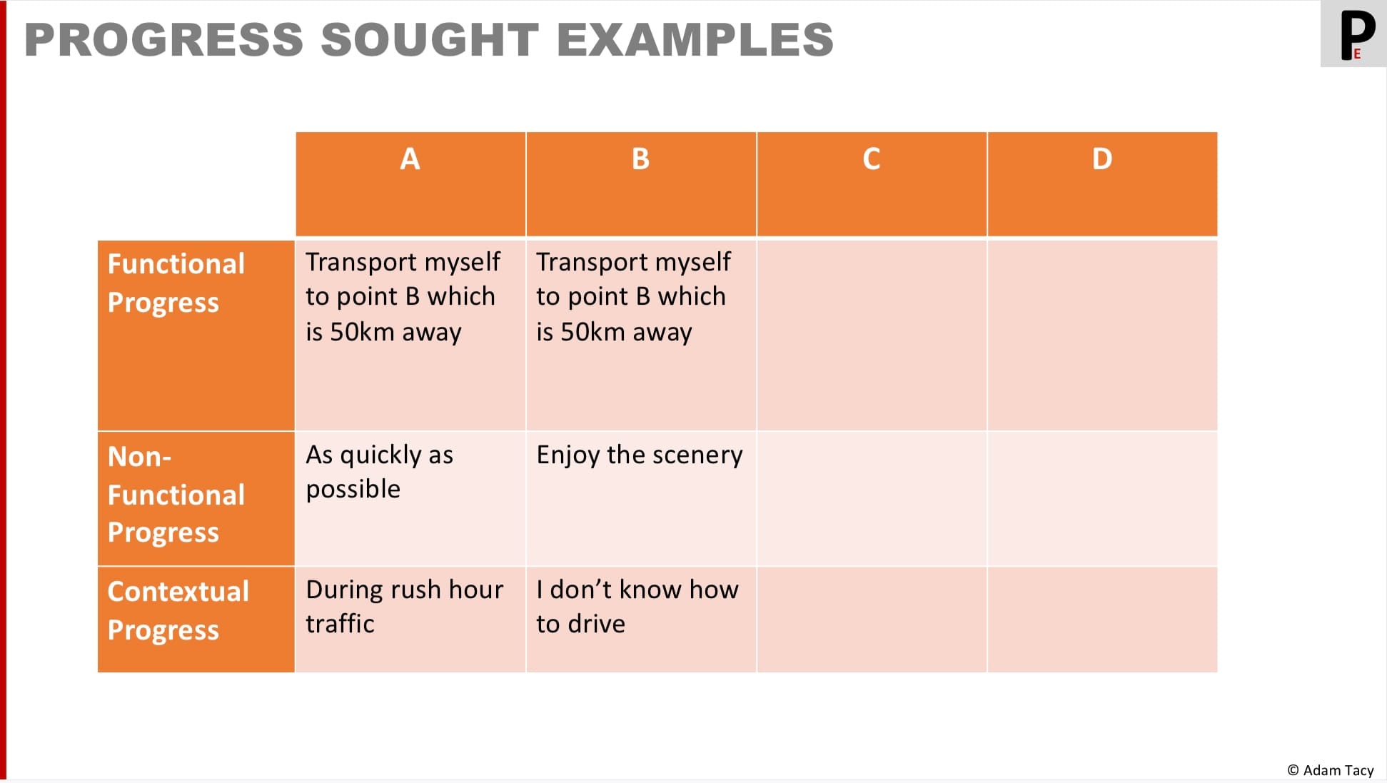 As seen above, examples of contextual progress relating to the functional progress of “transporting myself from A to B” could be “during rush hour” or “don’t know how to drive”. Of course we could argue that changing those contexts could be a progress sought. But let’s consider this for a moment…