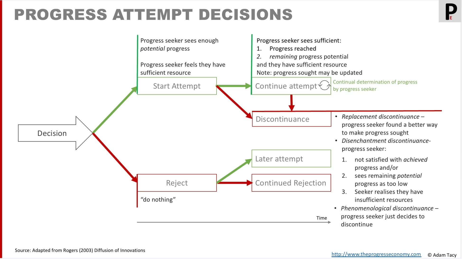 To start engaging a proposition, a progress seeker needs to see enough potential progress and that the six hurdles are low enough. Whilst to continue, they need to feel they have sufficient progress achieved, see sufficient potential progress, and that the six hurdles remains low enough.