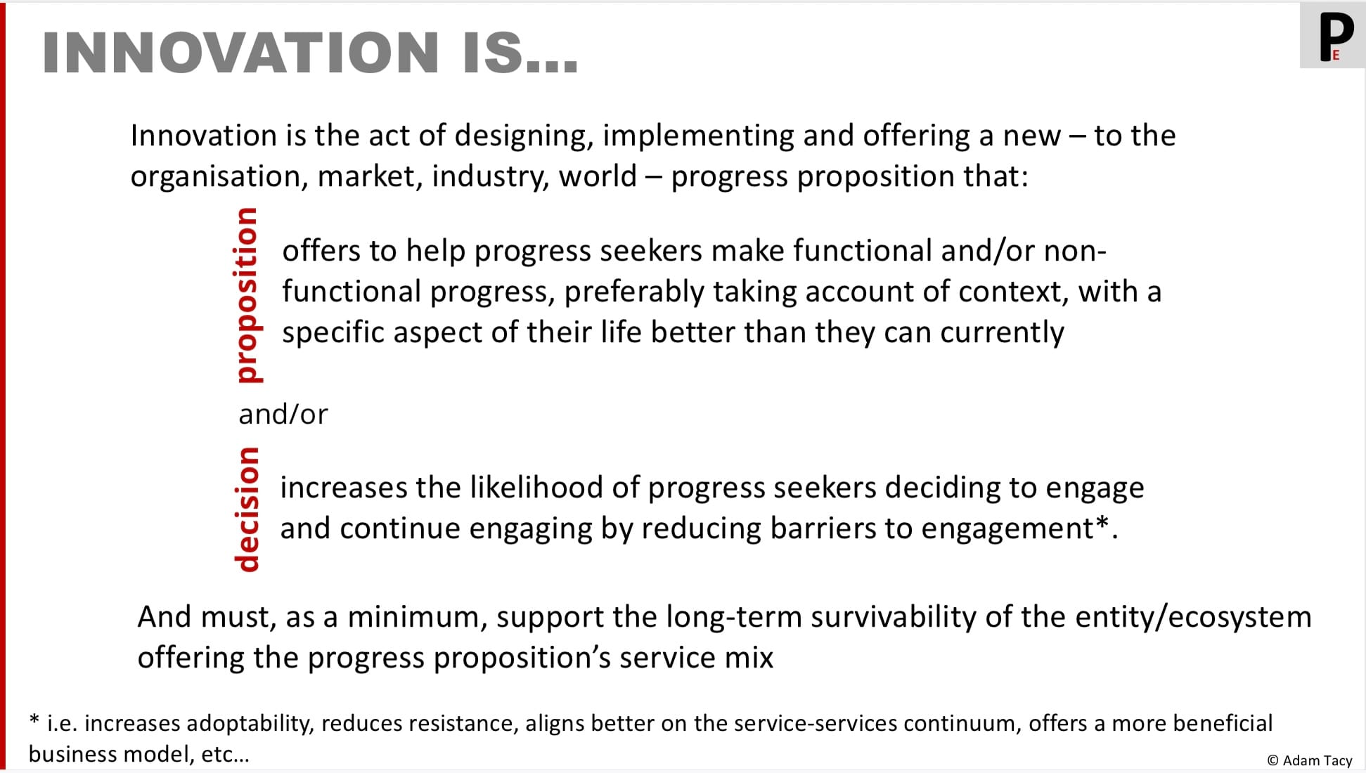 Innovation is then the acts of creating, implementing, and offering new progress propositions. These new propositions need to: