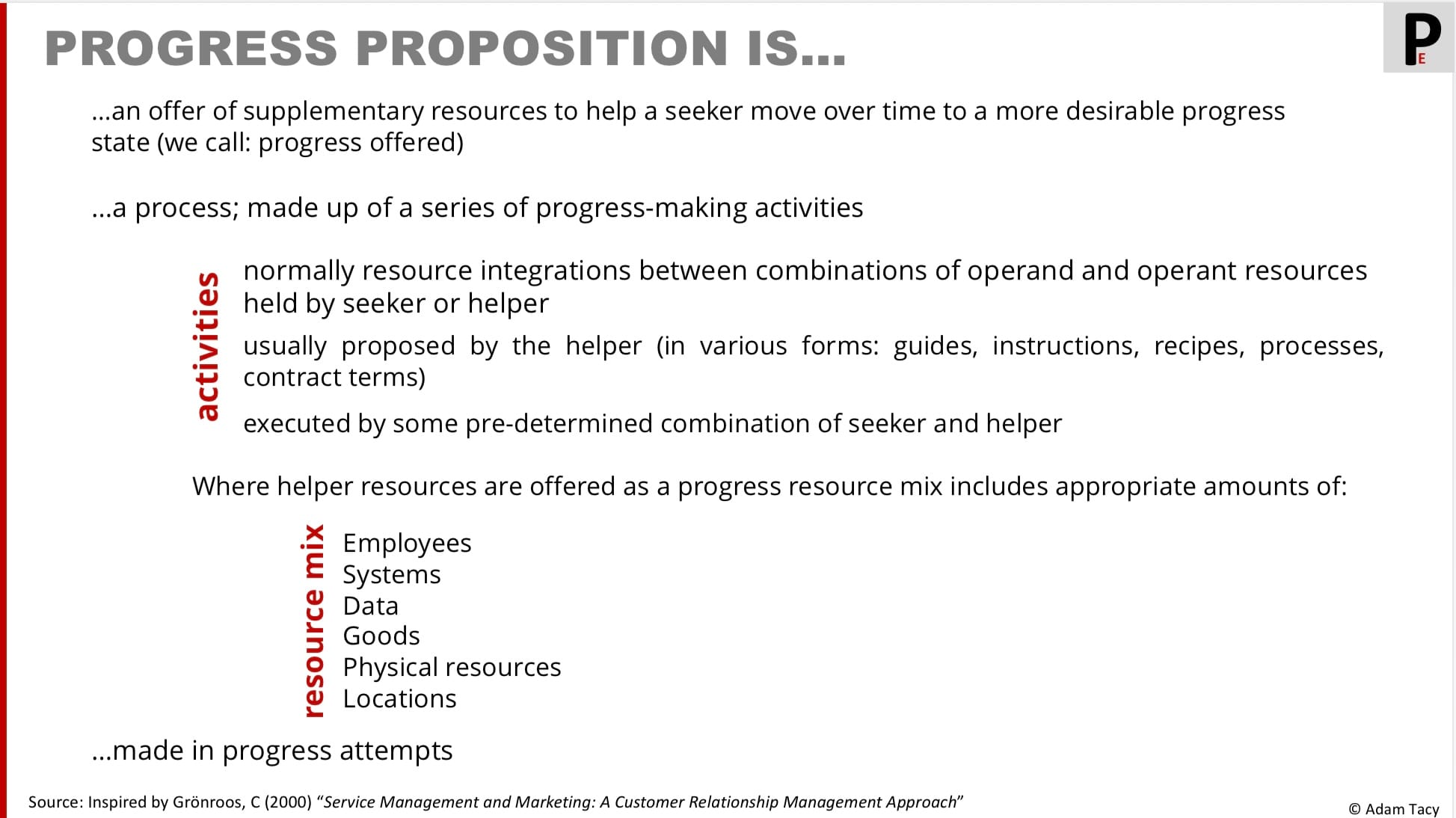 Service is an offer – a progress proposition – by an entity/ecosystem to help make specific progress. It is a process made up of a series of activities to move over time the progress seeker to a more desirable state. These activities usually take place as attempts to integrate seeker resources with entity/ecosystem resources (in the form of a service mix).
