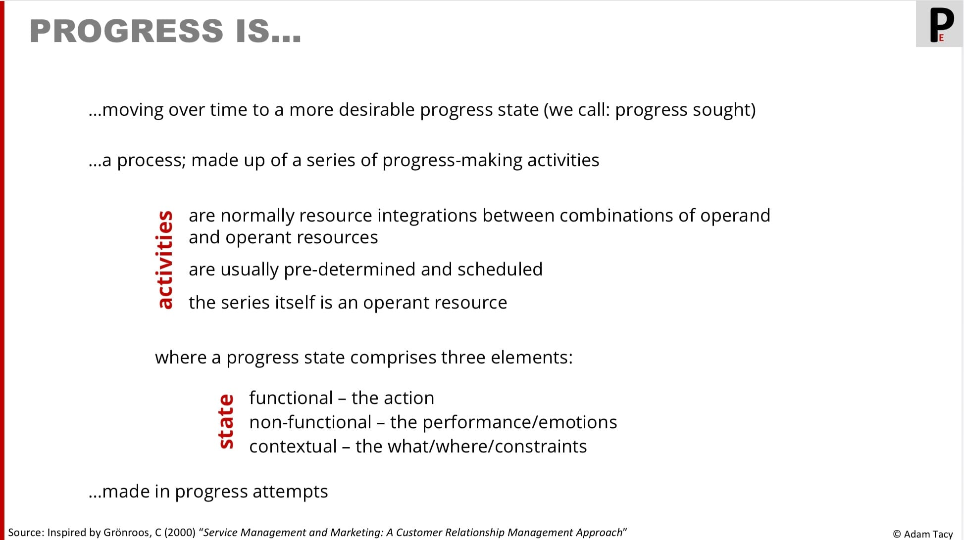 Progress sits, as expected, at the base. It is a process, i.e. a series of activities, that move over time move the progress seeker to a more desirable state. That is to say, progress seekers attempt to make progress. And this state comprises of functional and non-functional elements, informed by context.