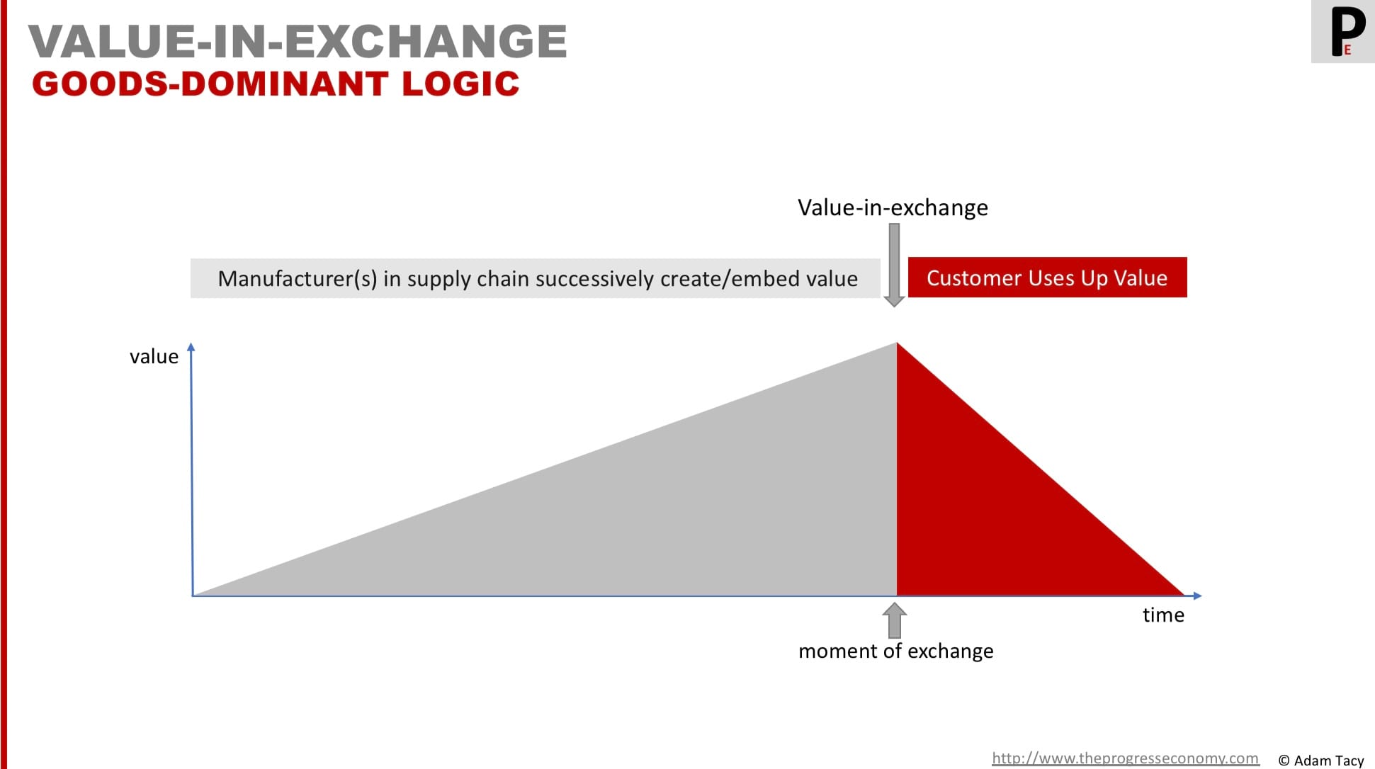 value-in-exchange – value is progressively added throughout the supply chain by manufacturers, exchanged at point of sale, and subsequently used-up/destroyed by end customer