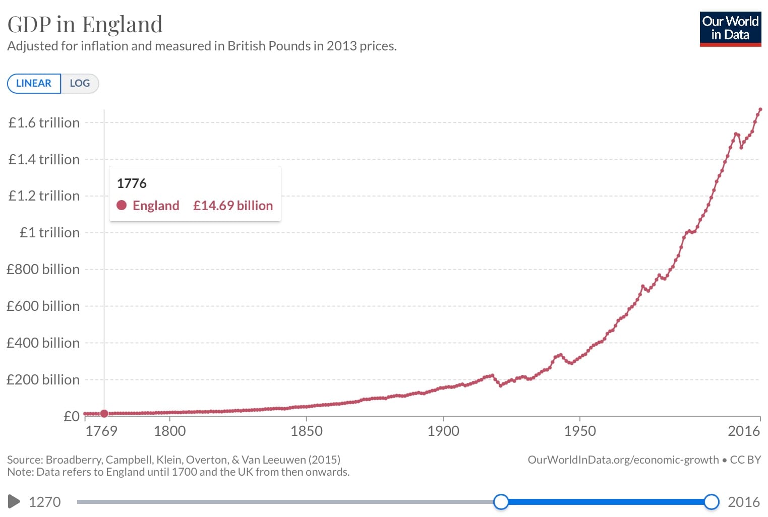 There is no doubt this model has been wildly successful. Just look at the growth since Smith’s time. Using Gross Domestic Product (GDP) for England as a proxy, economic growth soared from £14.6 billion to £1.67 trillion by 2016, adjusted for 2013 prices (source).